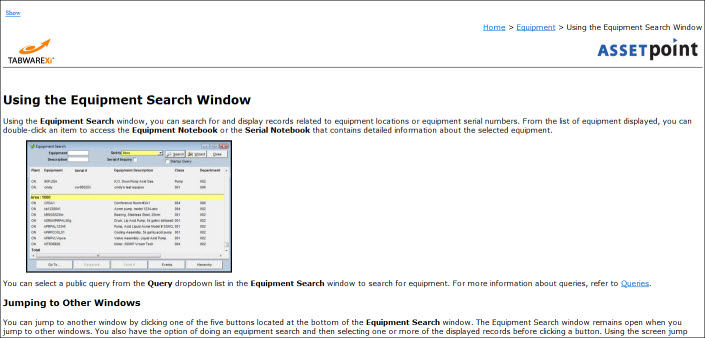 TabWare provides context-sensitive help. For example, if you are using the Equipment Search window, click the question mark icon on the toolbar. TabWare opens a help screen with specific information to help you use the Equipment Search window.