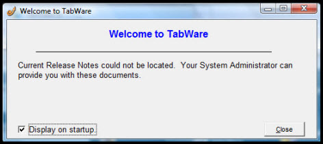 When you log in to TabWare, you are given the option to view a text file that contains information about the current release. The release notes list changes in the current release from the previous release. Once you have viewed the current release notes, you can remove the checkmark from the Display on startup checkbox so the message will not display during future logins.