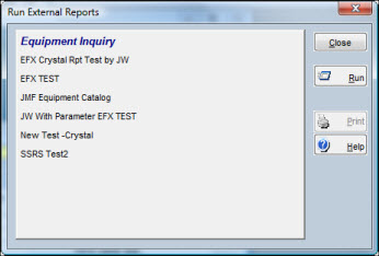 Click the Reports button (if available) or the Go To button and then select Reports. The Run External Reports window opens showing the list of reports that have been written for this module. |