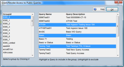 Select the group you want to process. The right-hand window displays all available public queries. Highlighted entries indicate the queries currently available to that group. |