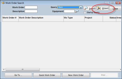 Generally, when you click on an icon from the main power panel, you access a search window. From that window, you can select from a list of queries and display results, and then use one or more displayed records to jump to other windows. Those same search windows have a Wizard button that can be clicked to access the Query Wizard.
