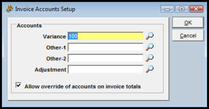 From the Invoice Matching Setup Options window, click the Accounts button to select account codes.