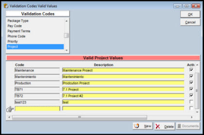 A checkmark in the Active field indicates that the project is actively available for selection. When the project is no longer active, remove the checkmark from this field. The project then is no longer available for selection, but remains as project of record on any documents left in the system. |