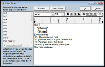 The size of the print labels is a function of the printer setup for the label printer, but you can click the Preview button to preview the layout of your label. You can insert a bitmap file by clicking the Insert Picture button.