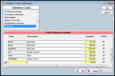 Access this window to enter valid values for Resource (Skill) codes used within TabWare.