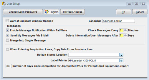 The Module Availability window in the Setup module shows the list of modules available at your site. If the Messaging option has been activated, a checkbox appears in the User Setup window with the caption Enable Message Notification Within TabWare. If you click that checkbox, two more options display. The first option defines the interval in minutes for sending a notification to you when there are messages waiting for you to read. The second option defines the length of time in days that you want messages kept for display in the Message Log window.