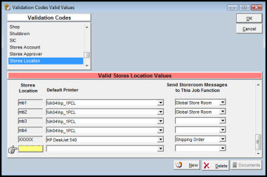 If your plant is not using the Multiple Warehousing feature, the stores location selected is Main and you do not have the option to add warehouses or to delete Main. However, you use this window to identify the storeroom printer to which picklists print and to identify the Job Function that should receive inventory messages.