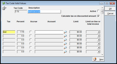 Use this window to create valid Tax Codes and specify the percentages that apply for the taxing jurisdictions indicated. By providing multiple percentages, you can specify, for example, the percentage that applies to a state tax as well as percentages for city and county taxes.