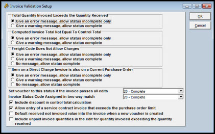 From the Invoice Matching Setup Options window, click the Validations button to access the Invoice Validation Setup window. This window sets the options for error checking and lets you choose settings for invoice status.