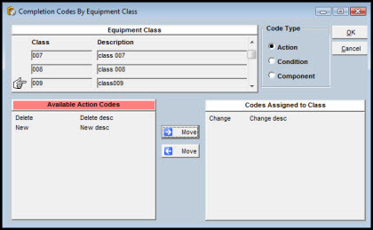 Completion codes operate with the processing of work orders. You use three types of completion codes for describing the conditions found before the repair work started, identifying the equipment components repaired, and defining the actions taken to complete the repairs. Using the Setting Up Completion Codes by Equipment Class window, you can modify the list of codes assigned for use with a particular equipment class.