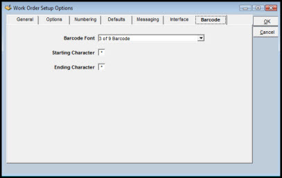 The Work Order Setup Options - Barcode window allows the system administrator to specify the barcode font, starting character, and ending character.