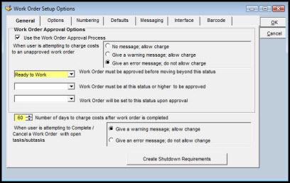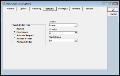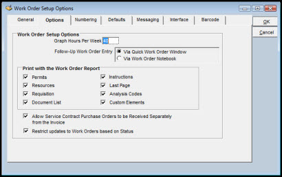 The Work Order Setup Options window enables the system administrator to specify the following: