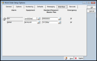Information coming from sources other than TabWare, such as condition monitoring equipment, can be used to cause TabWare to generate work orders. Use the Interface Tab to define alarm codes and to associate specific alarm codes with a Standard Request or a Master Plan and, optionally, an equipment number. Enter an alarm code in combination with a Standard Request/Master Plan, and TabWare automatically generates a work order based on that master plan or standard request when the alarm is received through the work order interface. If the emergency box is checked, the work order generated will be an Emergency work order rather than a Routine work order.