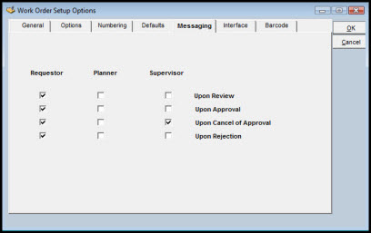 If your site uses the Work Order Approval and Messaging options, you can establish criteria for automatic routing of messages. The criteria consists of selecting who receives a message and deciding when a message originates.