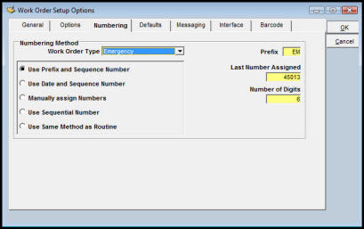 Each of the five work order types - Routine, Emergency, Standard Requests, PM Work Order, and PM Master Plans - can have its own scheme for numbering work orders. You can choose from the following four options when selecting a method for each of the work order types.
