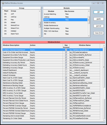 Use Define Window Access to configure window action security for TabWare Analytics. Select Metrics in the Module list and then click the box in the Has Access column to grant or remove access to the Analytics windows. Access settings are shown below: