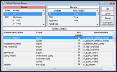 You can give a particular group of users access to actions or selected windows within a module by selecting individual window actions or by copying settings from another group.