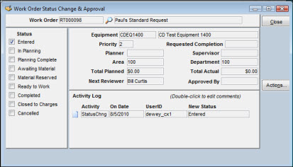 From the Message Log window, you can select incoming action messages for additional processing. For example, the action message may indicate that you are the next reviewer for a specific work order. By selecting an action message for additional processing, you open the Work Order Status Change & Approval window for the work order that requires reviewing.