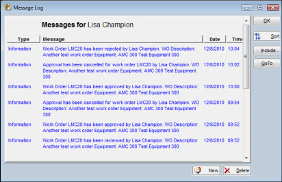 An action message displays in the Message Log window when you have been designated to perform a prescribed action, such as approve a work order. Action messages first appear in blue text. After you have viewed the message, the text color changes to black.